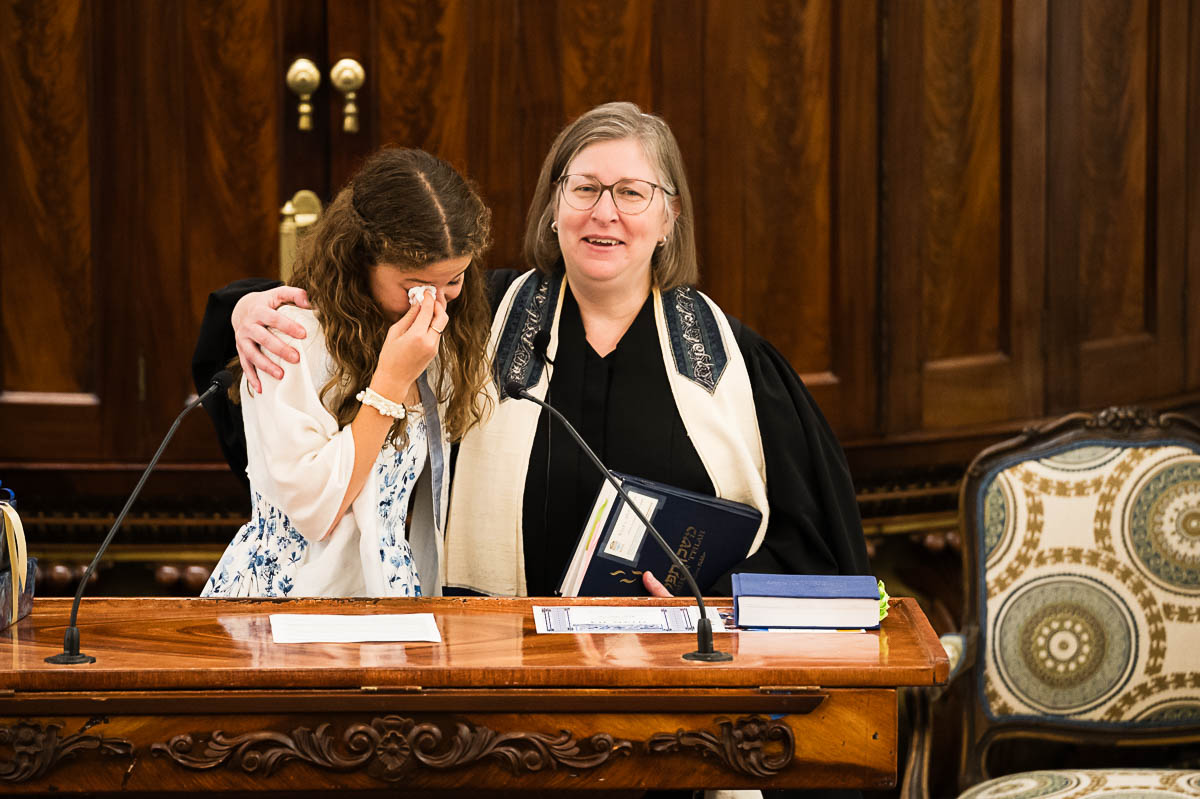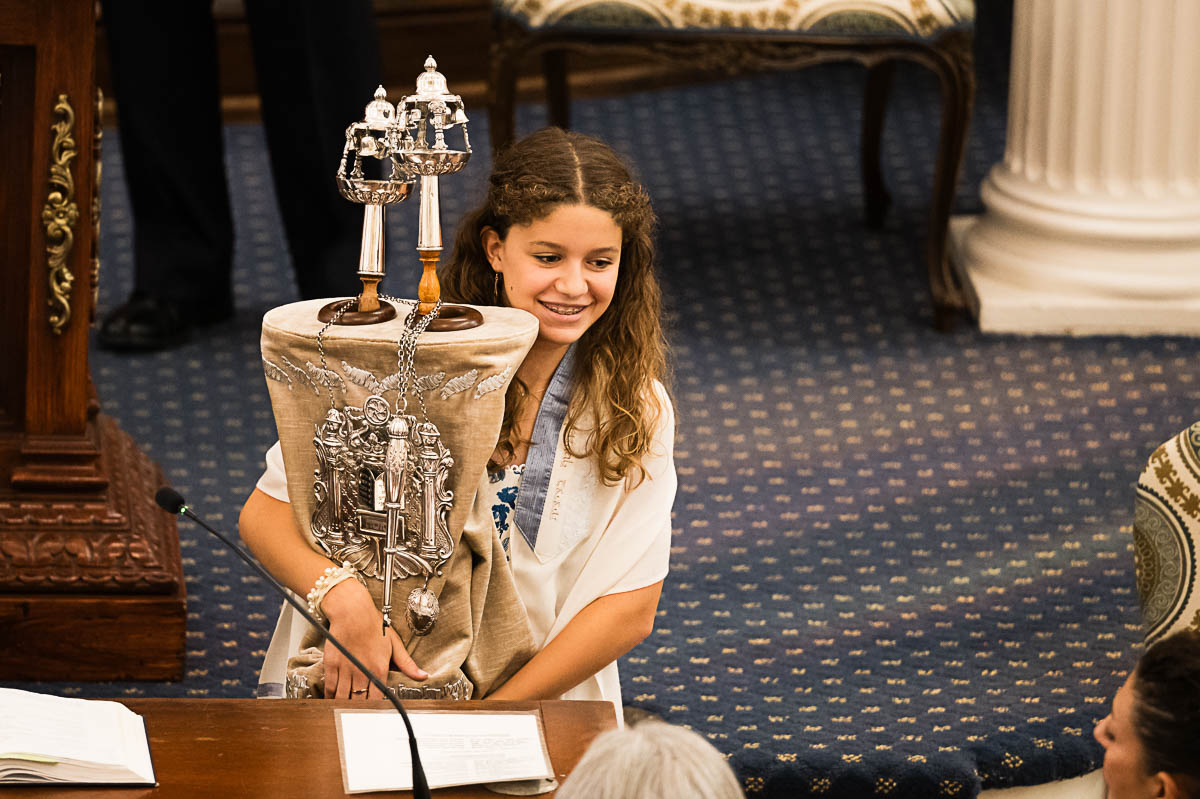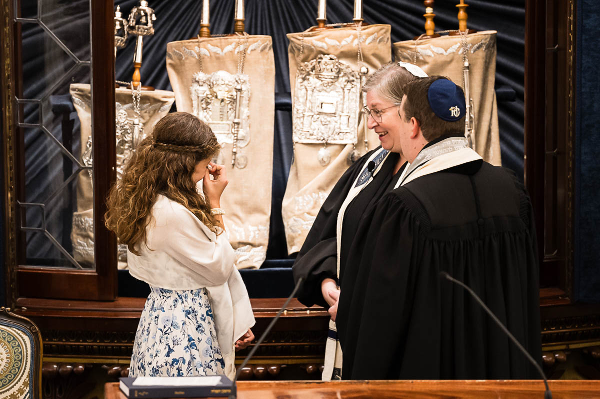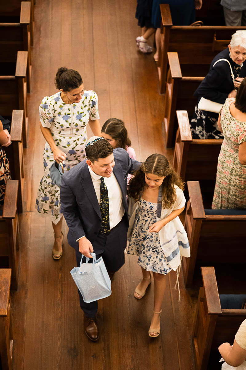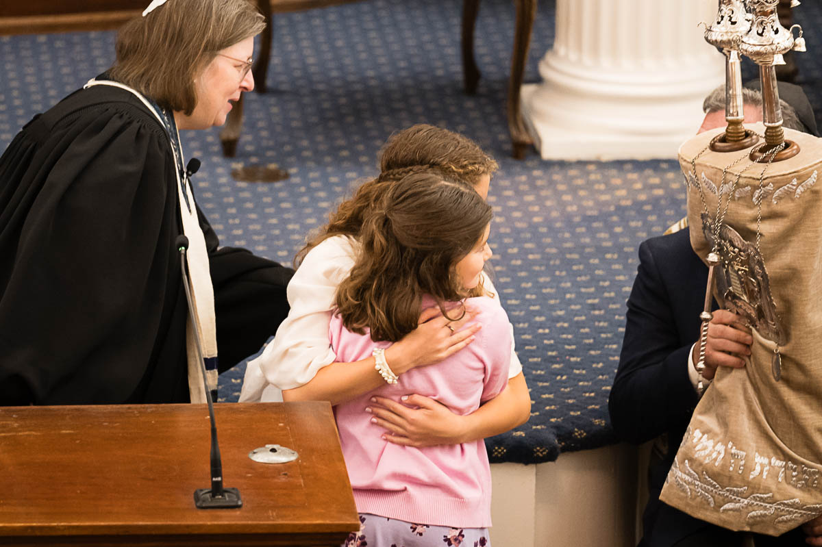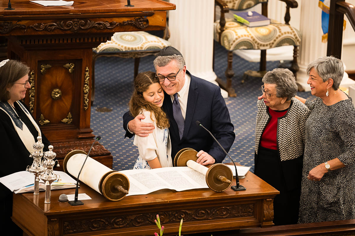 After family portraits, everyone went inside to prepare for the ceremony. Eva was radiant, and her smile lit up the entire sanctuary as she read from the Torah, marking an important milestone in her spiritual journey. The synagogue’s stunning architecture provided a gorgeous backdrop for heartfelt photos of this special day, capturing both intimate moments and lively celebrations. It was clear that Eva and Rabbi Alexander had a close connection. Several touching moments between student and rabbi, as well as between Eva and her parents, brought me close to tears. But when Eva and her little sister embraced after Nora helped her big sis cover the Torah, I lost it! There is nothing so touching as the love between two sisters.