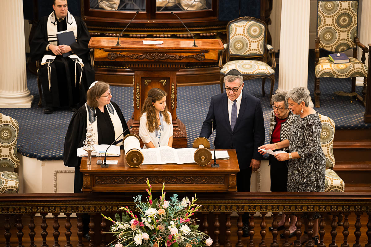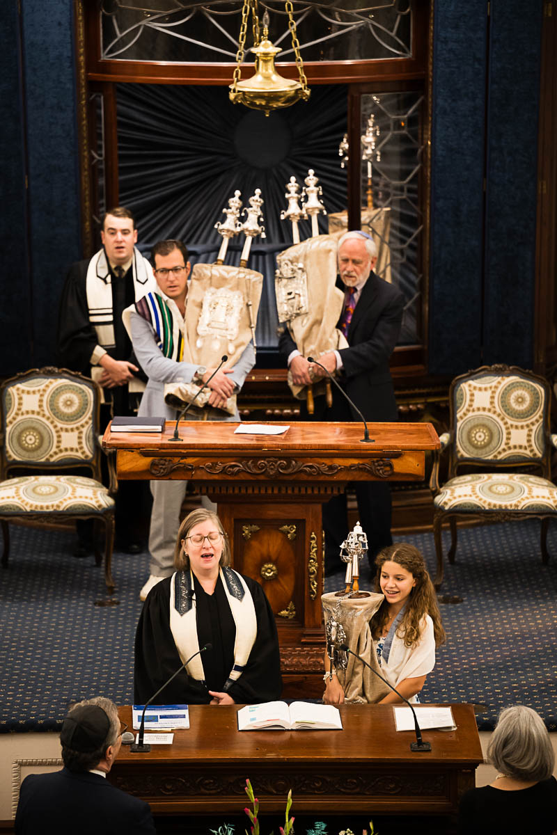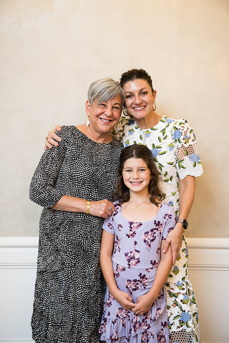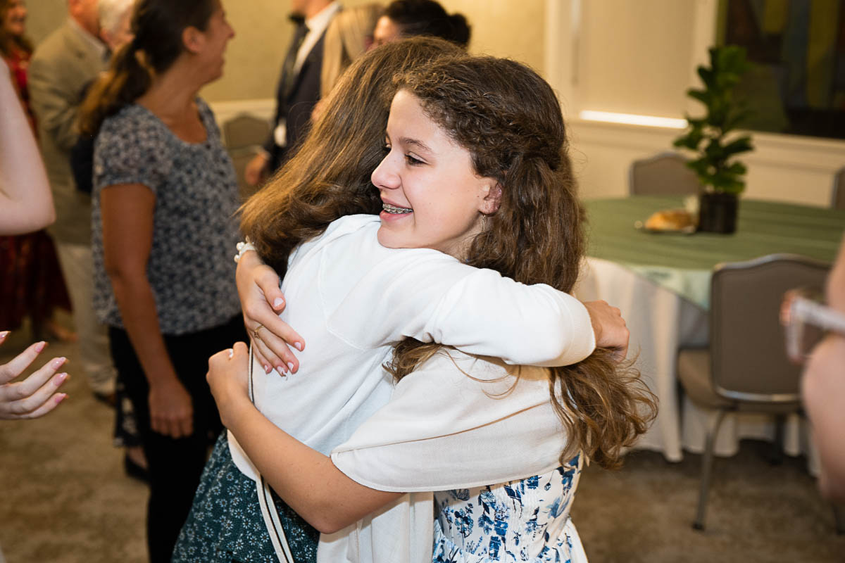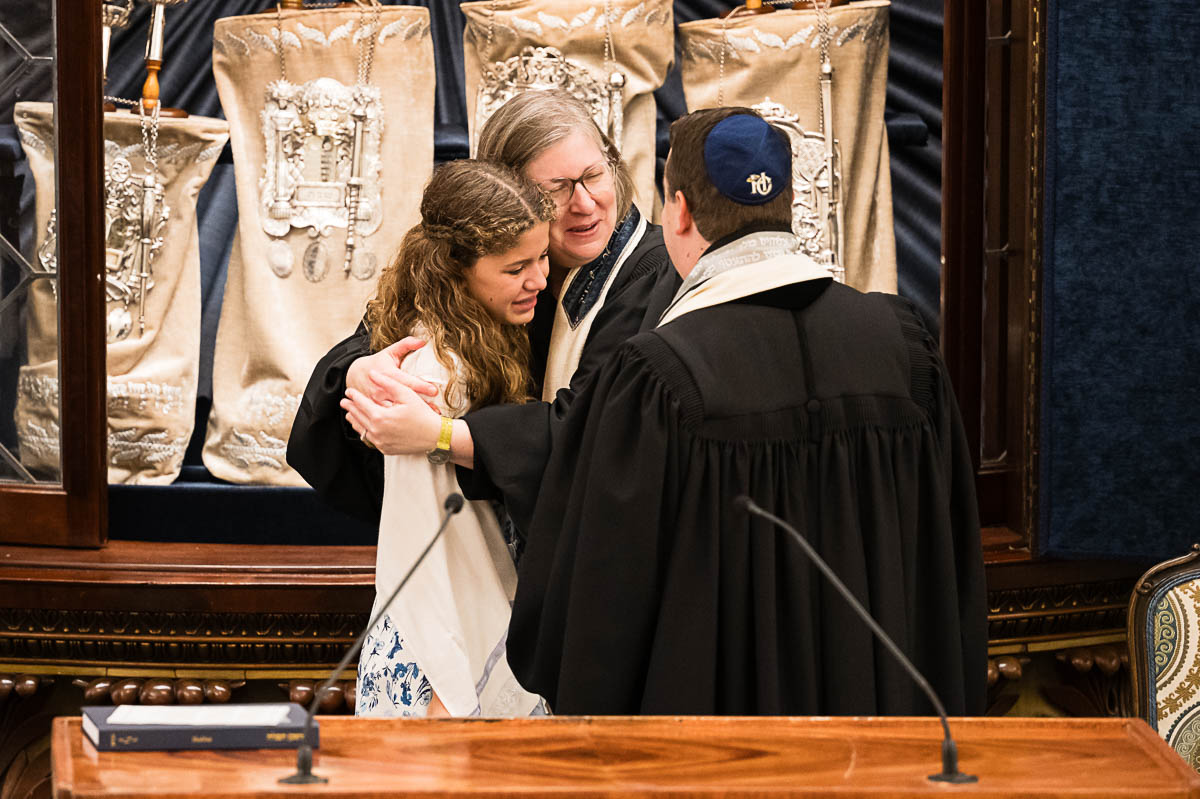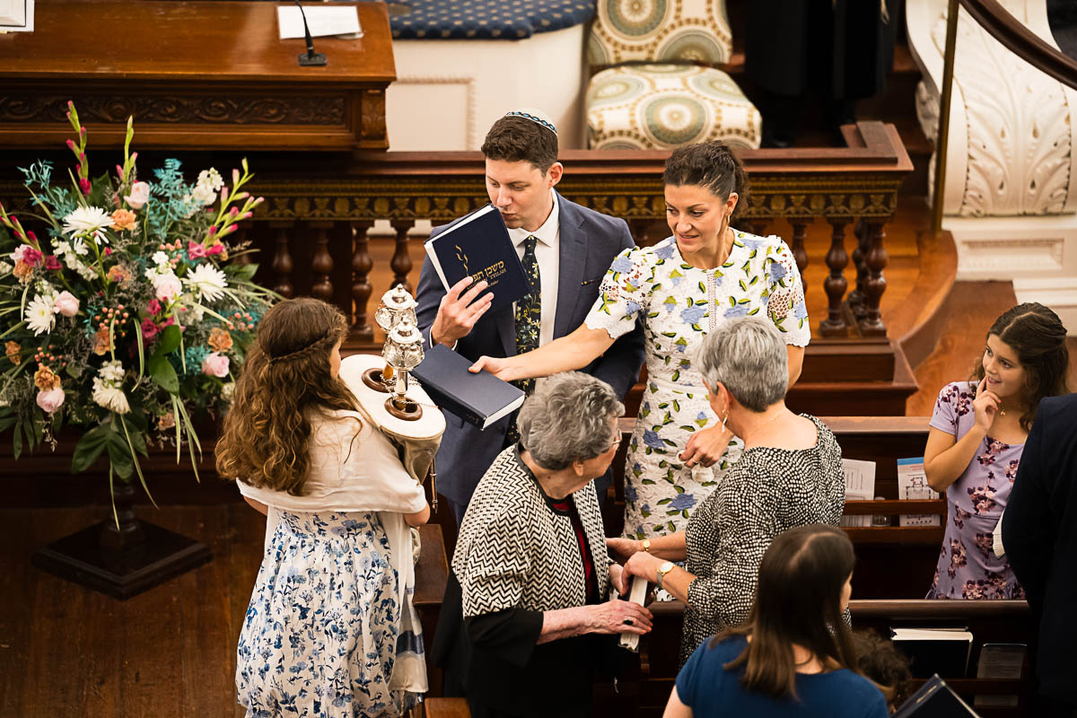 After family portraits, everyone went inside to prepare for the ceremony. Eva was radiant, and her smile lit up the entire sanctuary as she read from the Torah, marking an important milestone in her spiritual journey. The synagogue’s stunning architecture provided a gorgeous backdrop for heartfelt photos of this special day, capturing both intimate moments and lively celebrations. It was clear that Eva and Rabbi Alexander had a close connection. Several touching moments between student and rabbi, as well as between Eva and her parents, brought me close to tears. But when Eva and her little sister embraced after Nora helped her big sis cover the Torah, I lost it! There is nothing so touching as the love between two sisters.