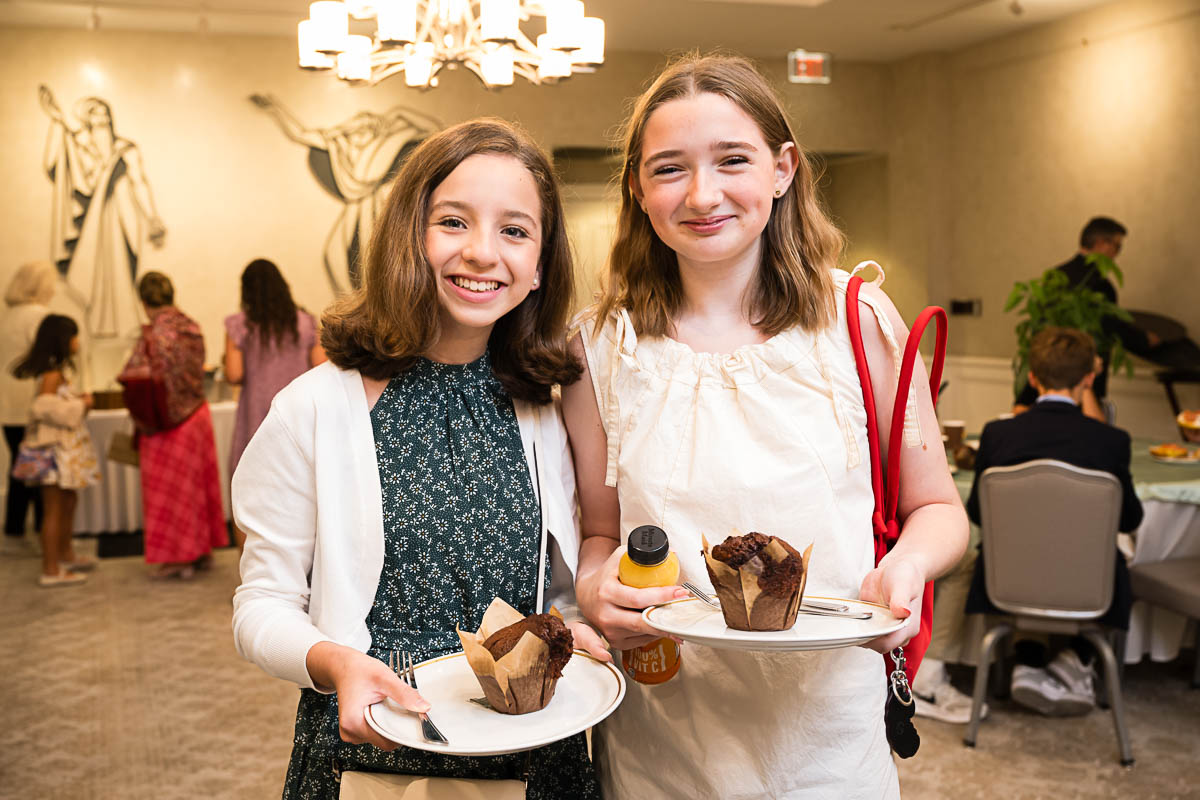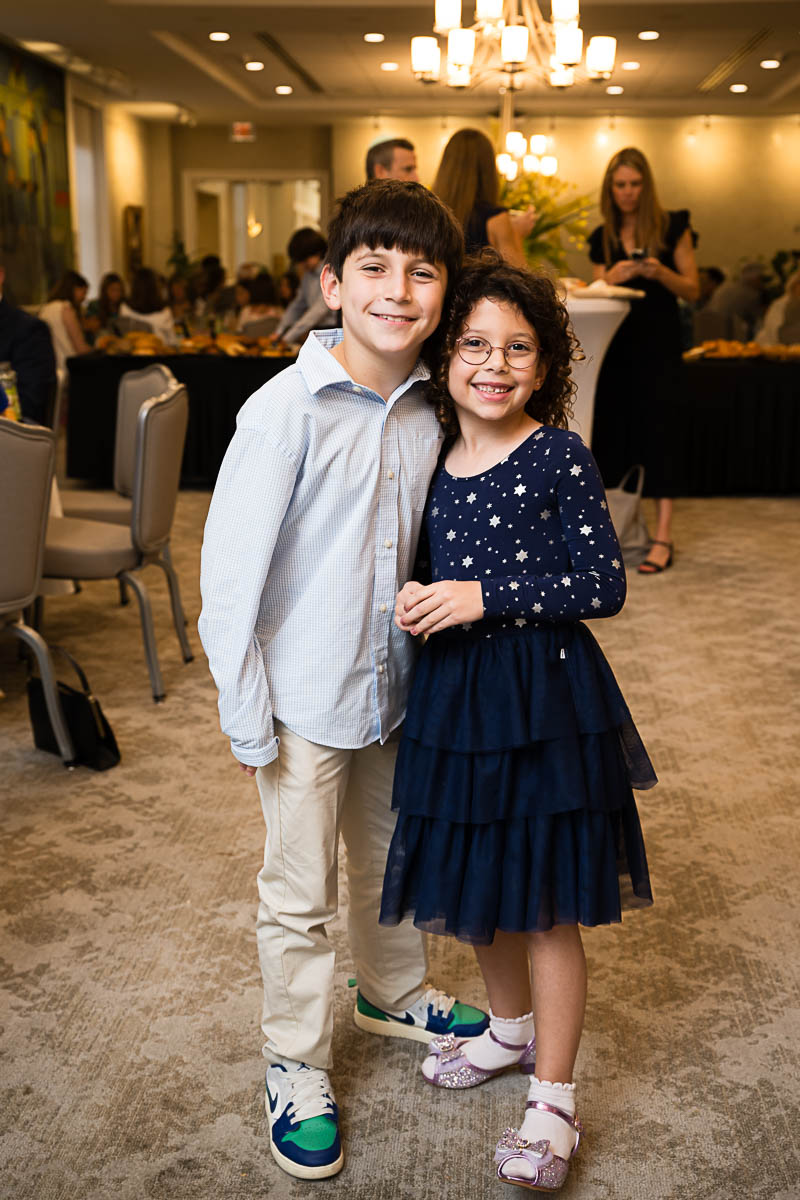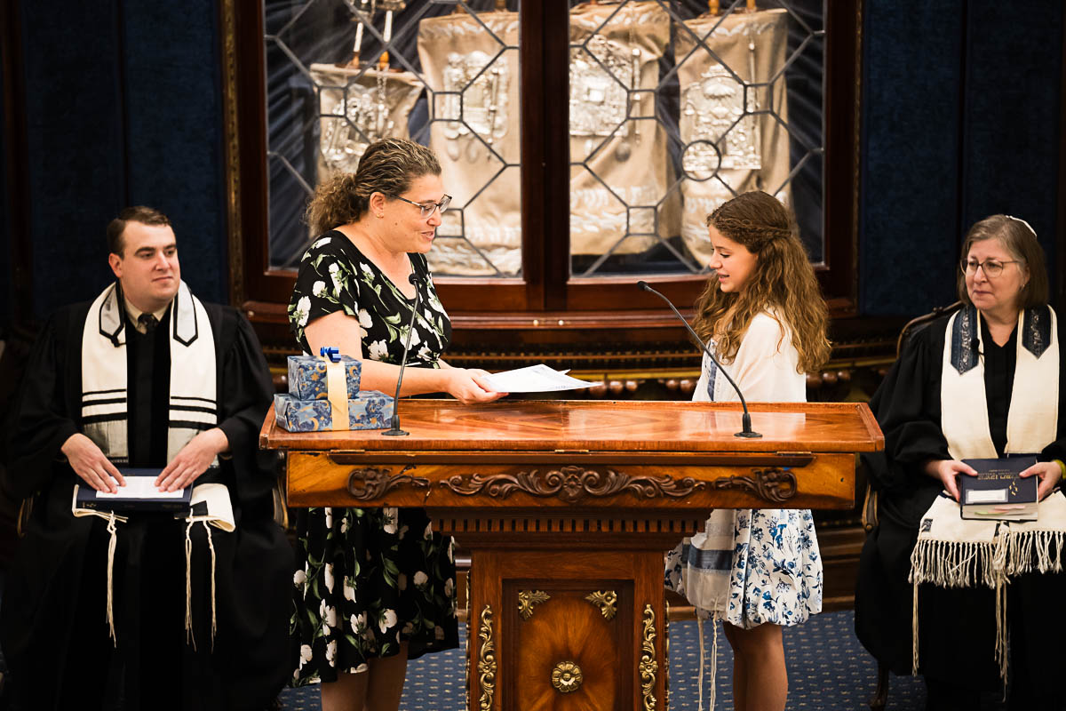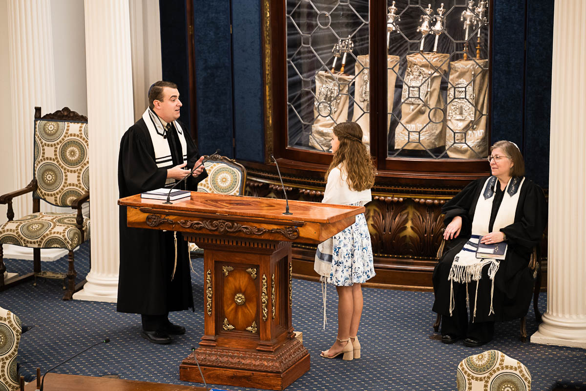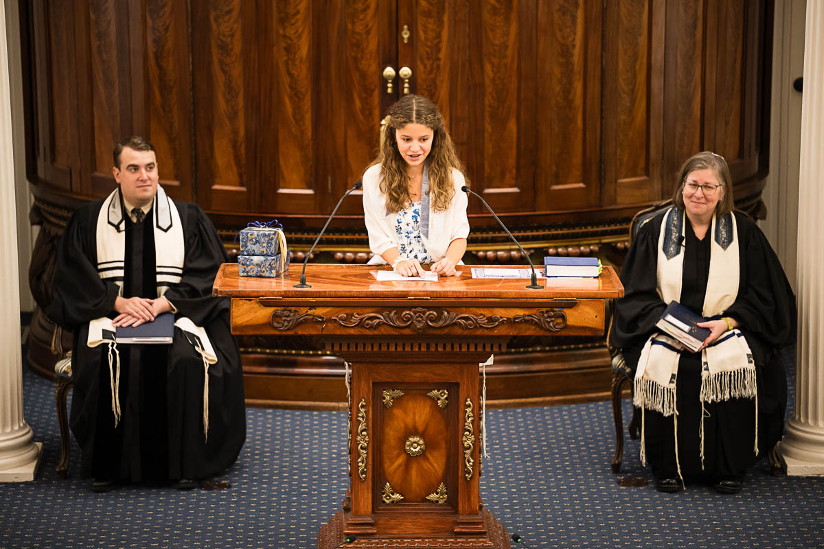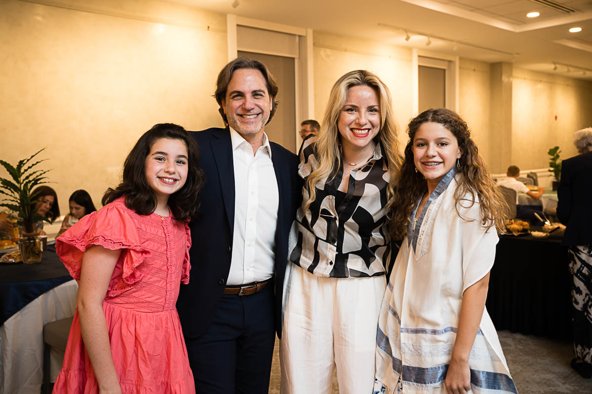 After family portraits, everyone went inside to prepare for the ceremony. Eva was radiant, and her smile lit up the entire sanctuary as she read from the Torah, marking an important milestone in her spiritual journey. The synagogue’s stunning architecture provided a gorgeous backdrop for heartfelt photos of this special day, capturing both intimate moments and lively celebrations. It was clear that Eva and Rabbi Alexander had a close connection. Several touching moments between student and rabbi, as well as between Eva and her parents, brought me close to tears. But when Eva and her little sister embraced after Nora helped her big sis cover the Torah, I lost it! There is nothing so touching as the love between two sisters.
