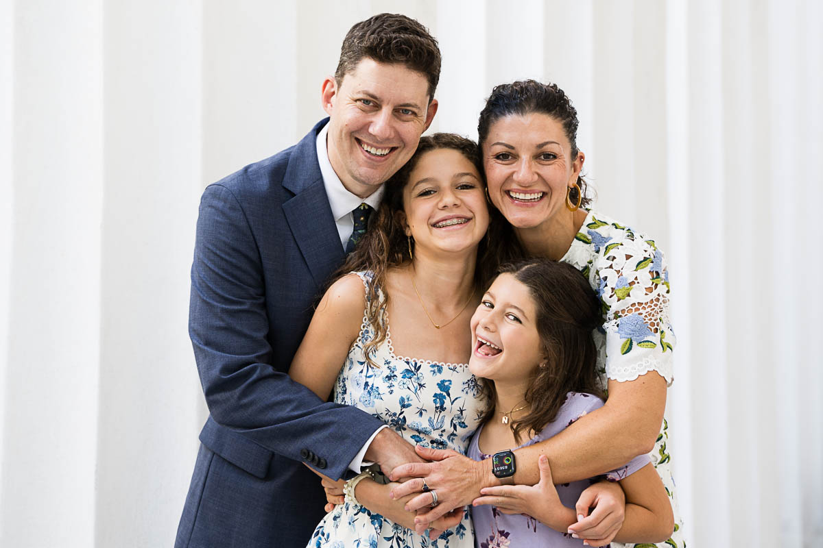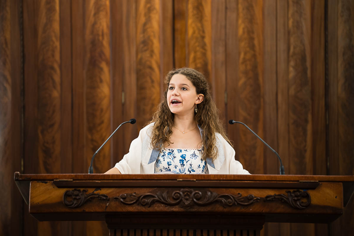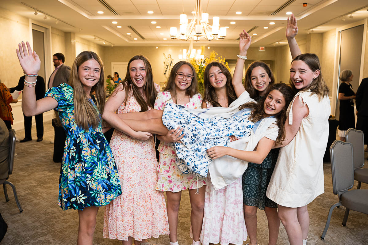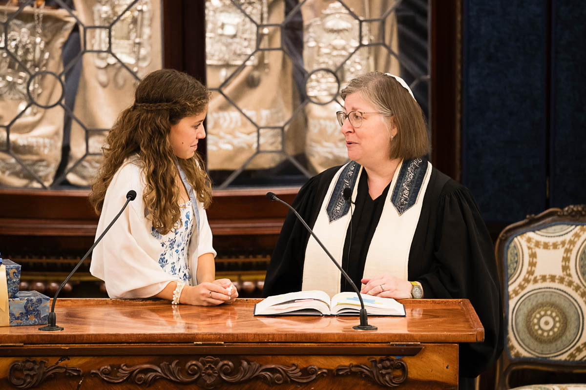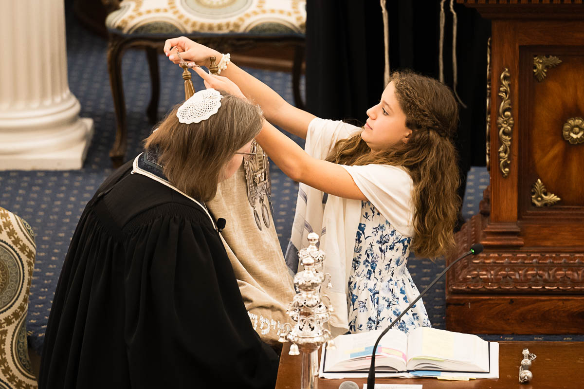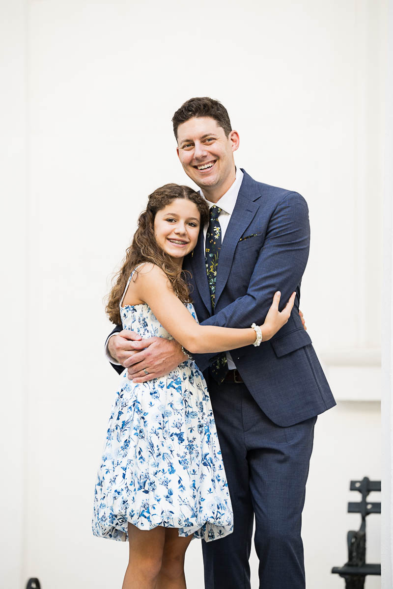 After family portraits, everyone went inside to prepare for the ceremony. Eva was radiant, and her smile lit up the entire sanctuary as she read from the Torah, marking an important milestone in her spiritual journey. The synagogue’s stunning architecture provided a gorgeous backdrop for heartfelt photos of this special day, capturing both intimate moments and lively celebrations. It was clear that Eva and Rabbi Alexander had a close connection. Several touching moments between student and rabbi, as well as between Eva and her parents, brought me close to tears. But when Eva and her little sister embraced after Nora helped her big sis cover the Torah, I lost it! There is nothing so touching as the love between two sisters.
