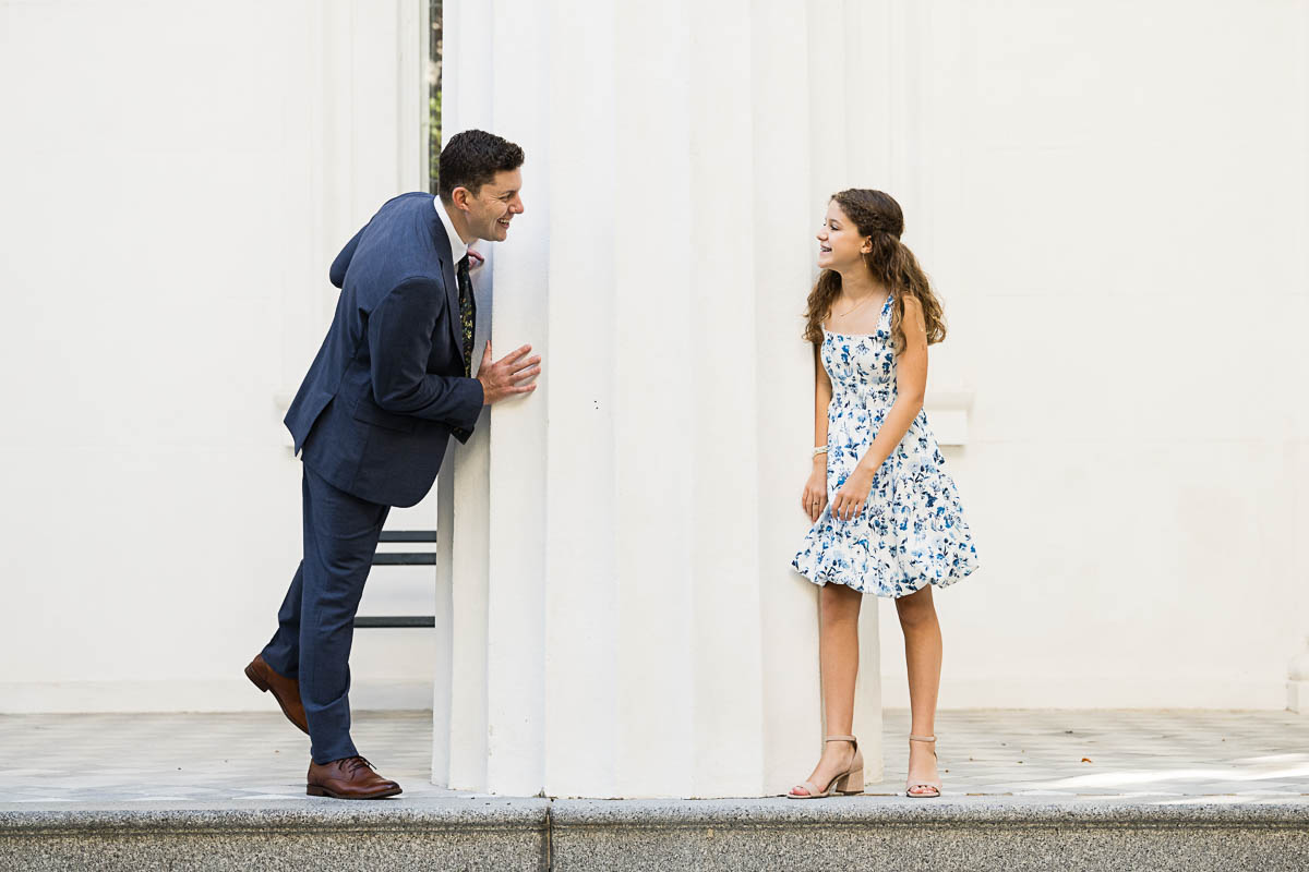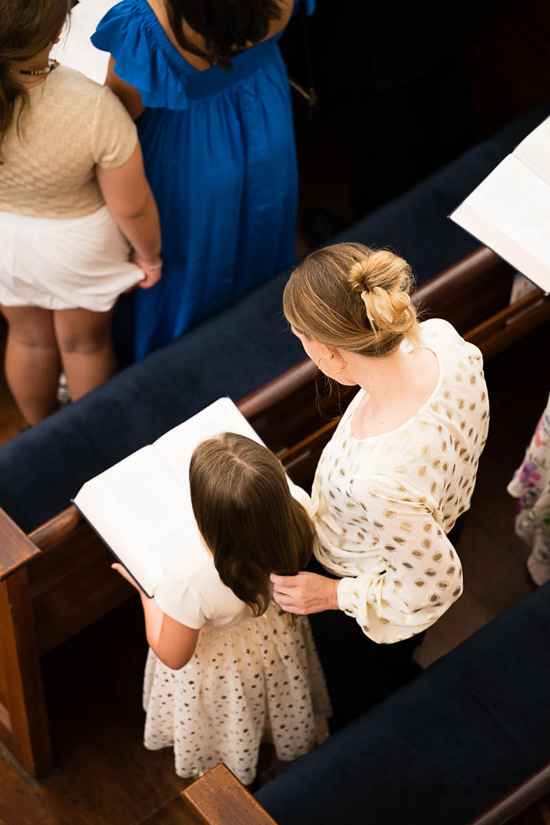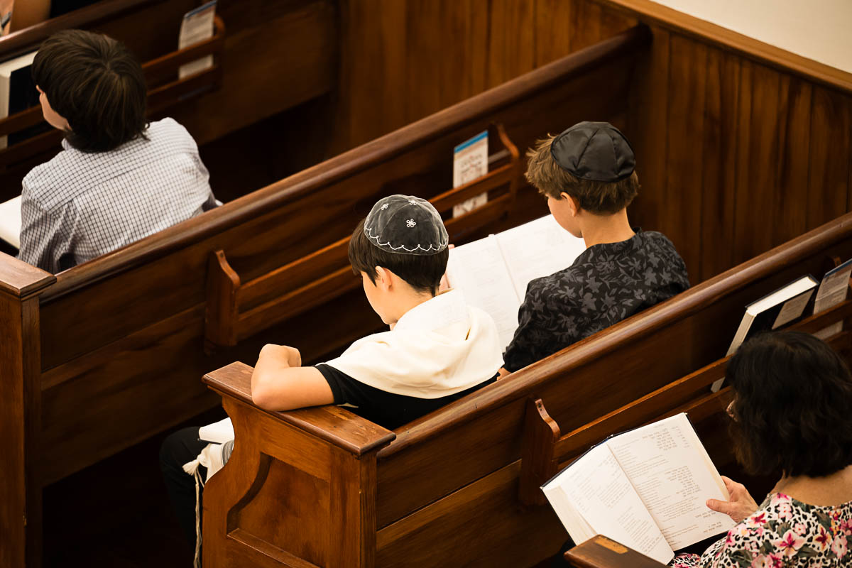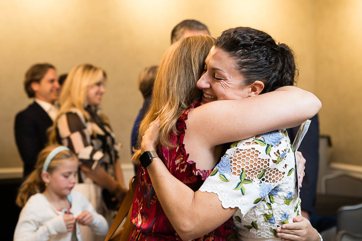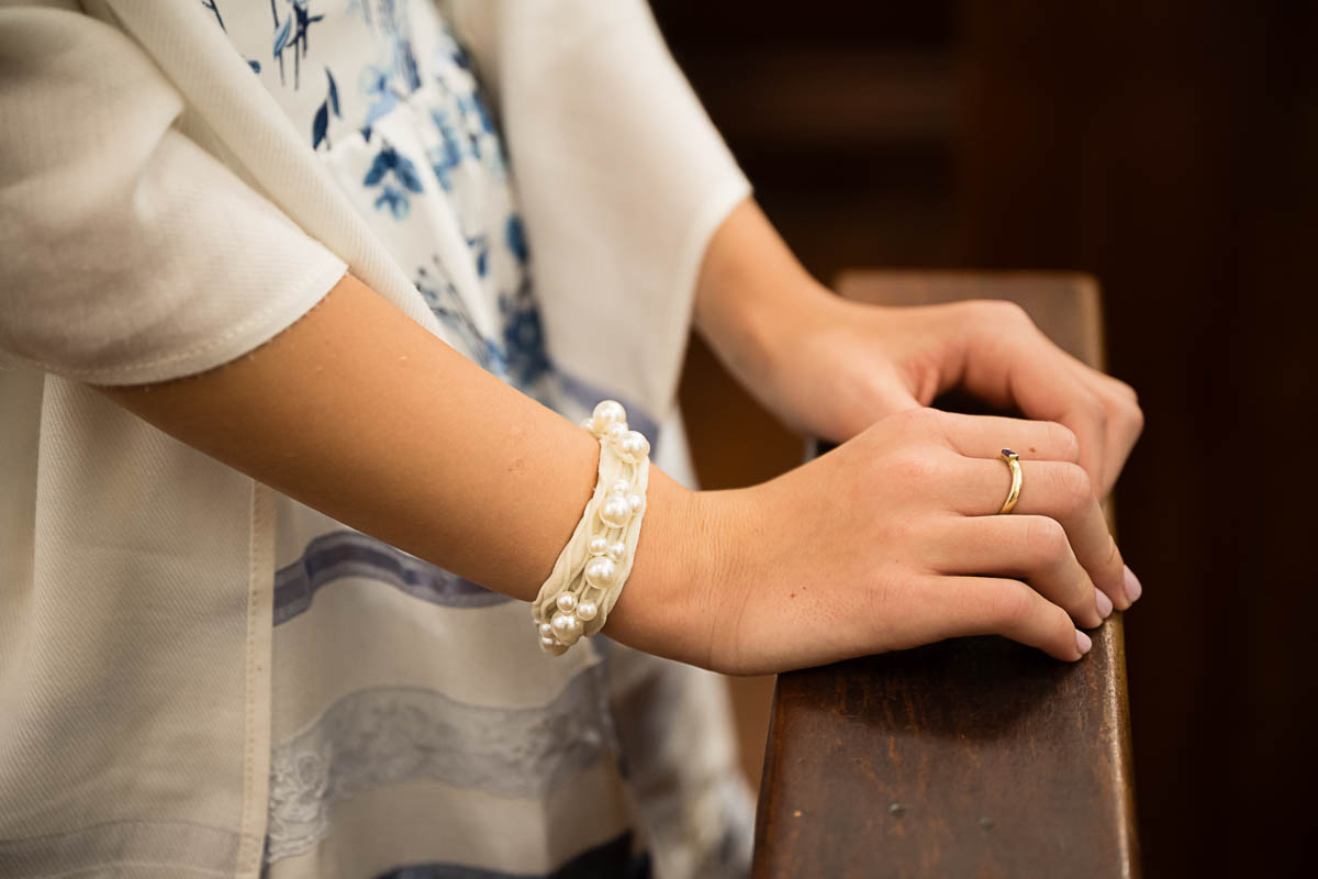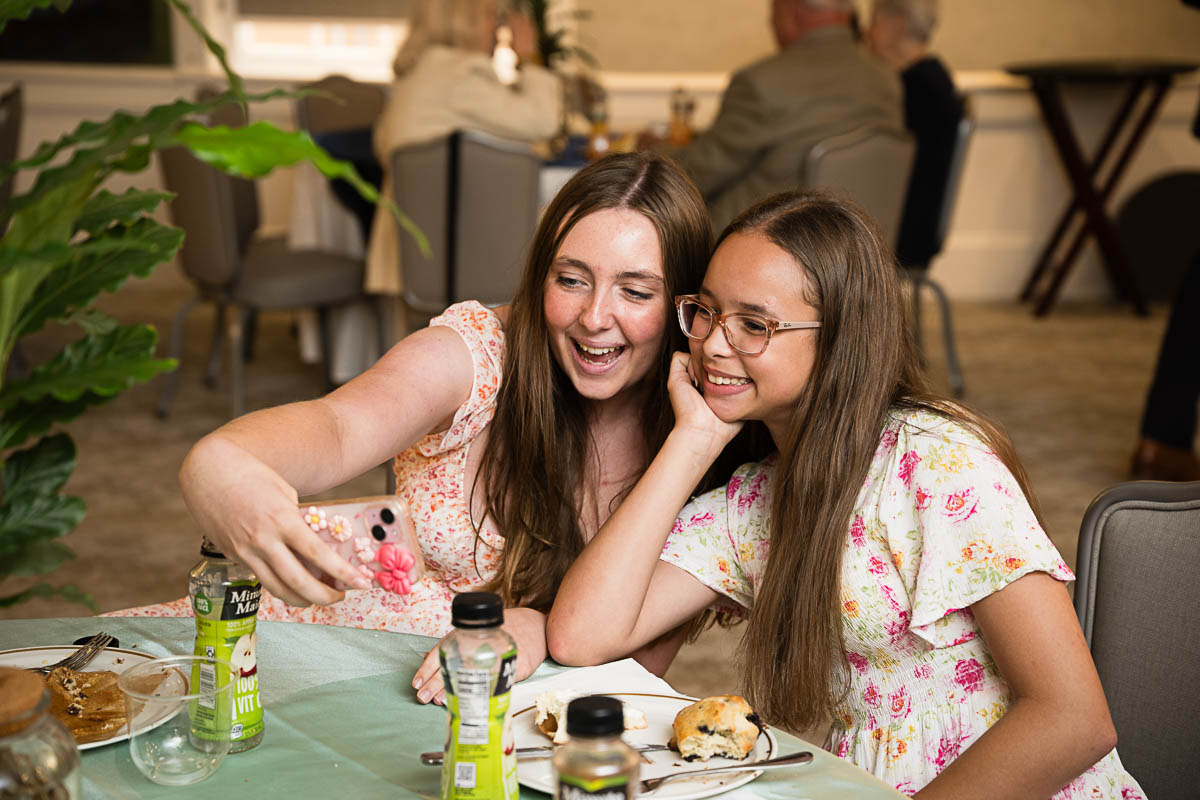 After family portraits, everyone went inside to prepare for the ceremony. Eva was radiant, and her smile lit up the entire sanctuary as she read from the Torah, marking an important milestone in her spiritual journey. The synagogue’s stunning architecture provided a gorgeous backdrop for heartfelt photos of this special day, capturing both intimate moments and lively celebrations. It was clear that Eva and Rabbi Alexander had a close connection. Several touching moments between student and rabbi, as well as between Eva and her parents, brought me close to tears. But when Eva and her little sister embraced after Nora helped her big sis cover the Torah, I lost it! There is nothing so touching as the love between two sisters.