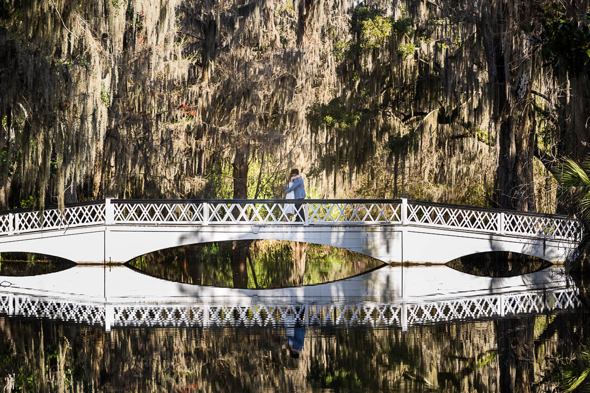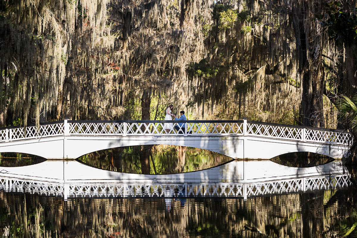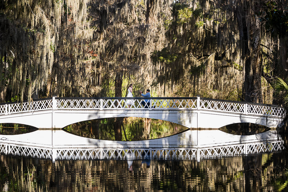 Kai and I spent several months carefully planning every detail to make sure the moment unfolded perfectly. He chose the iconic white bridge at Magnolia Plantation and Gardens as the setting, which couldn’t have been more romantic. On the big day, I hid behind a tree at the far end of the pond so Savannah wouldn’t suspect a thing. From there, I photographed the moment with a dual-camera setup using two Nikon Z9 bodies—one paired with the Nikkor Z 400mm f4.5 S lens to capture the proposal from a distance, and the other with the Nikkor Z 70-180mm f2.8 lens to showcase more of the scene.