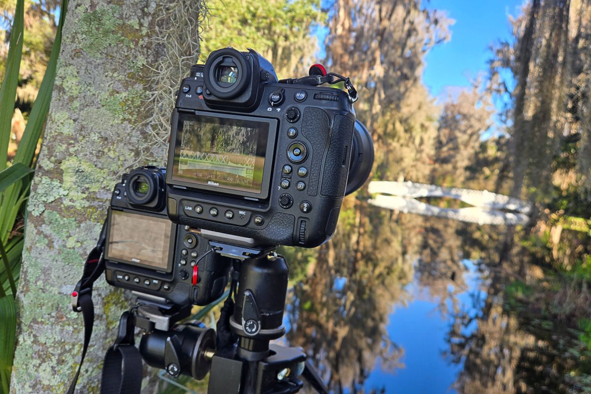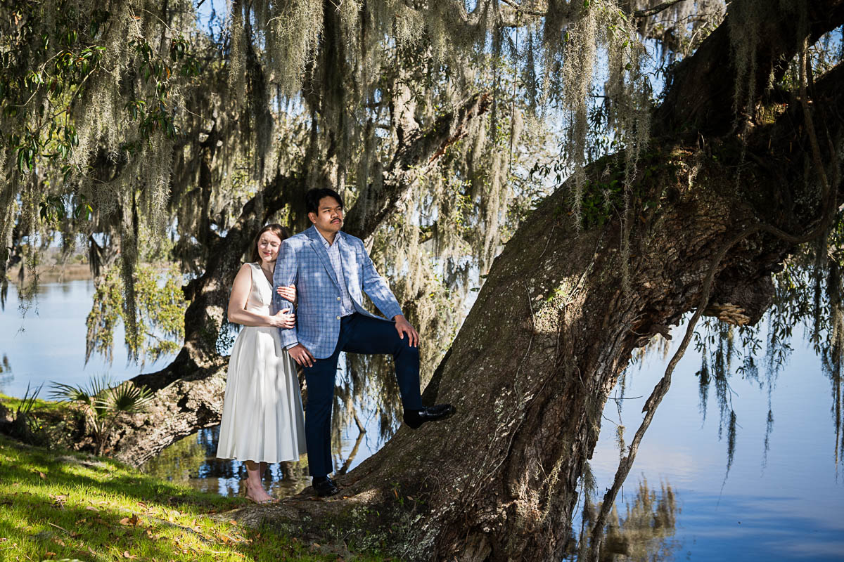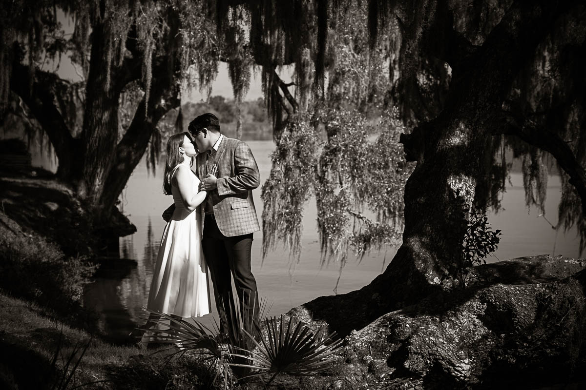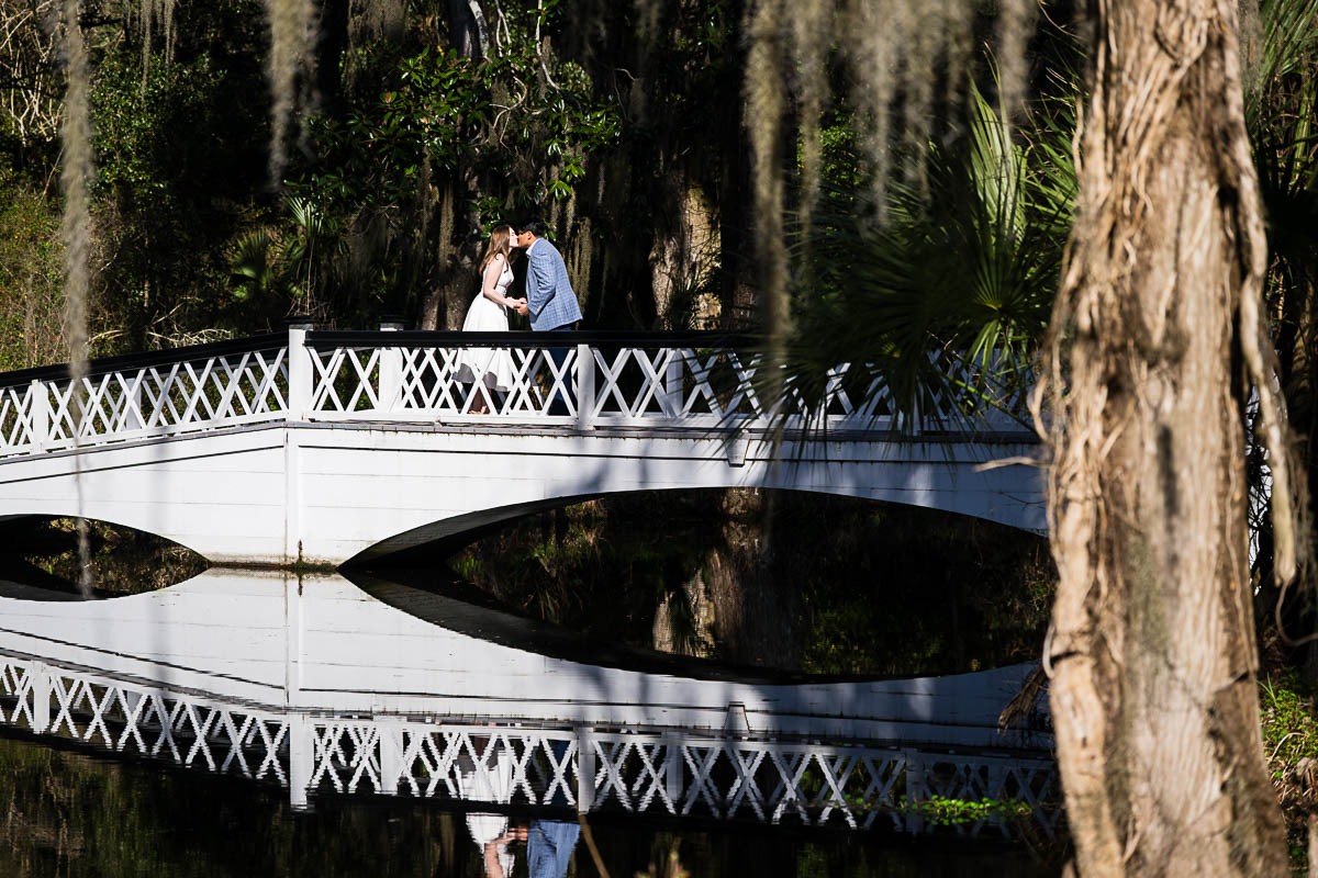 Kai and I spent several months carefully planning every detail to make sure the moment unfolded perfectly. He chose the iconic white bridge at Magnolia Plantation and Gardens as the setting, which couldn’t have been more romantic. On the big day, I hid behind a tree at the far end of the pond so Savannah wouldn’t suspect a thing. From there, I photographed the moment with a dual-camera setup using two Nikon Z9 bodies—one paired with the Nikkor Z 400mm f4.5 S lens to capture the proposal from a distance, and the other with the Nikkor Z 70-180mm f2.8 lens to showcase more of the scene.