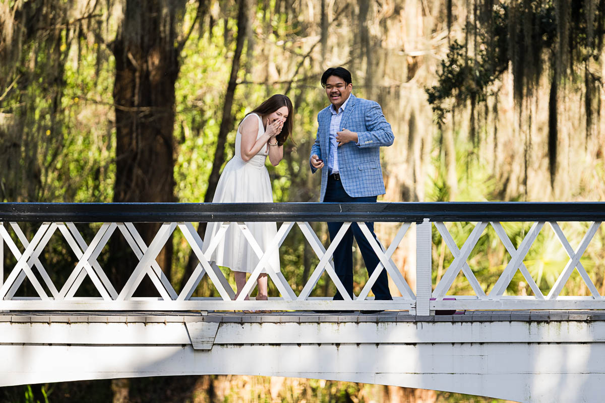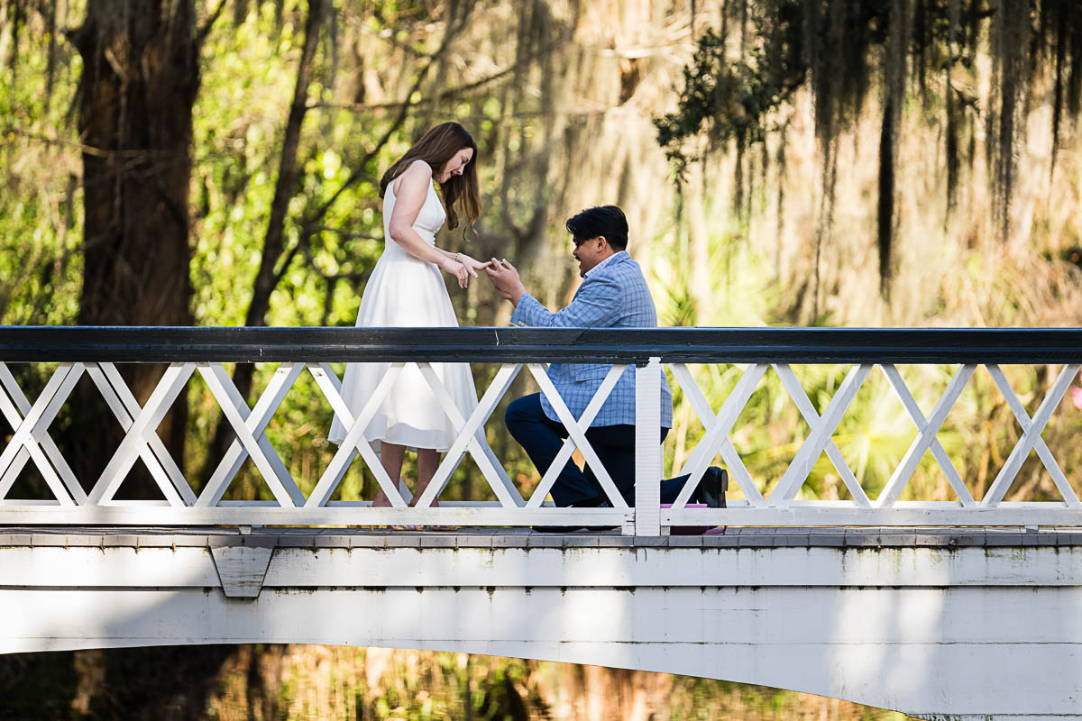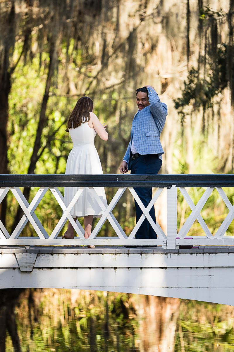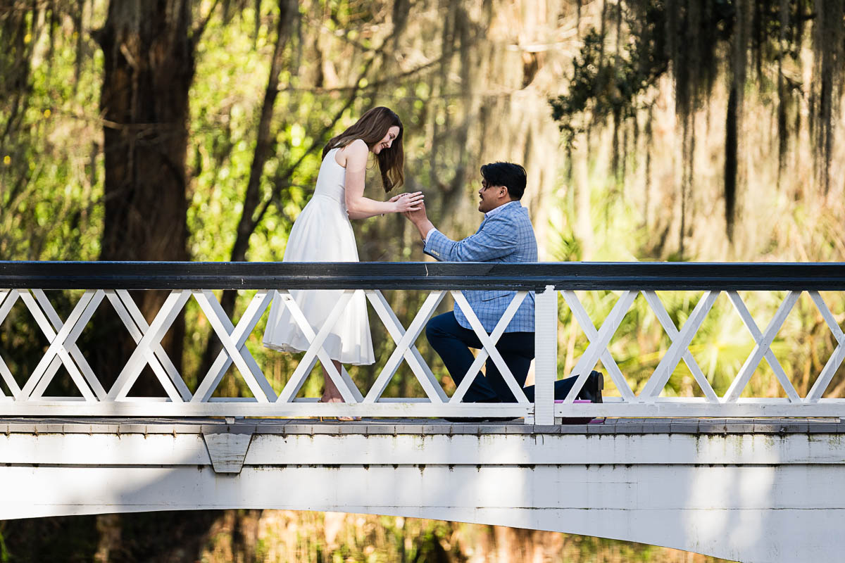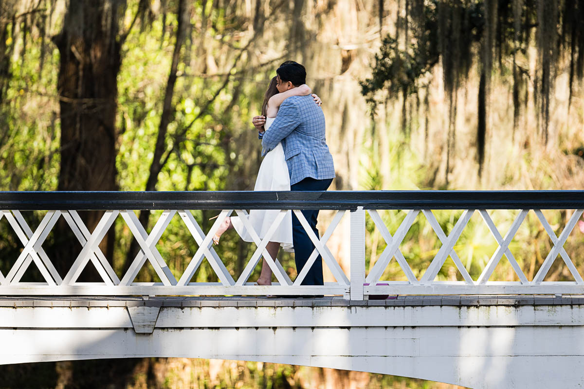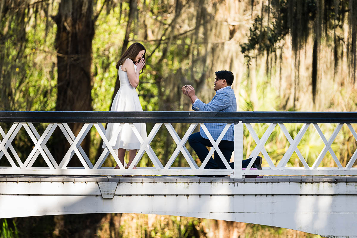 Kai and I had created a schedule, and mapped out a route for him to lead her to the bridge. Even though she had no idea what we were up to, and he had never been there before, Kai somehow managed to get her to Magnolia Plantation right on schedule, and lead her right down the path I had told him to take. Kai had cleverly told her he was there on a work trip and had to make a presentation to his team. He asked if they could get to the plantation early so that he could practice his speach! Arriving at “the spot”, he handed her a copy of the speech so she could read along. Only instead of a work speech, it was his declaration of love and devotion to Savannah. I could see the emotions welling up as she read along. Then he got down on one knee and asked her to be his wife. She said YES!!!