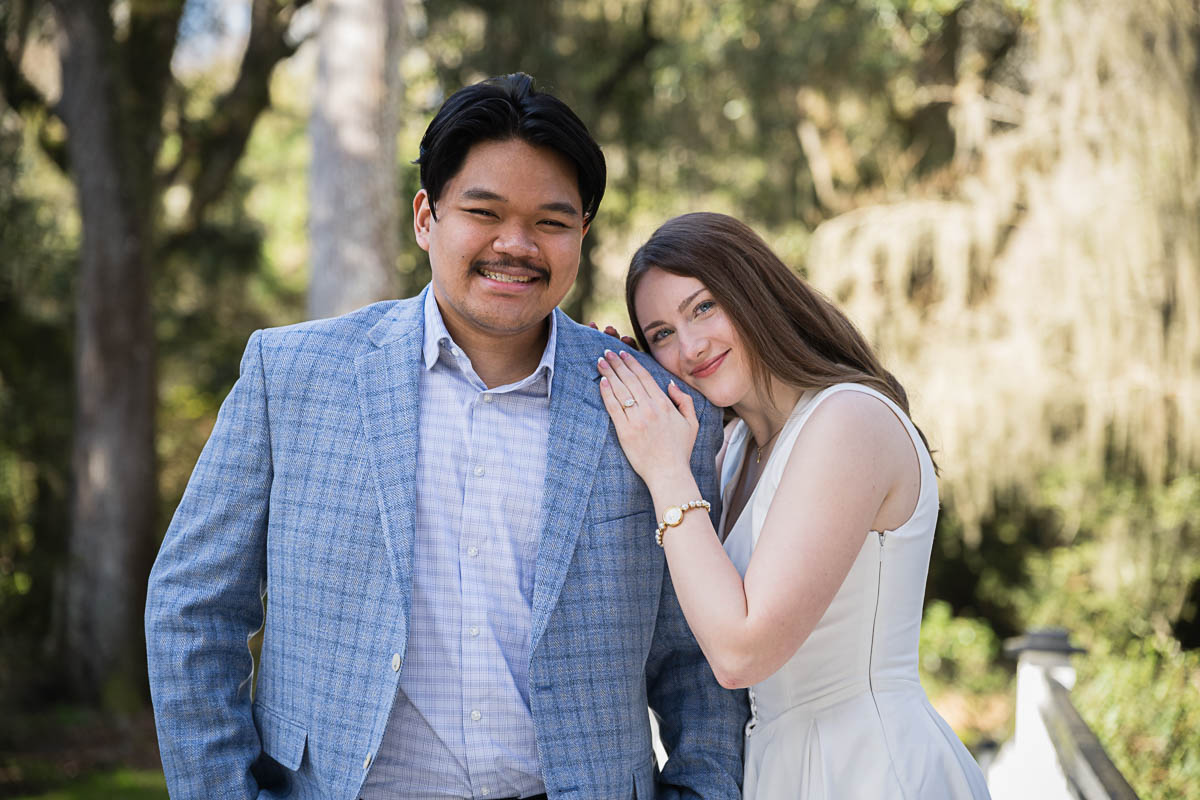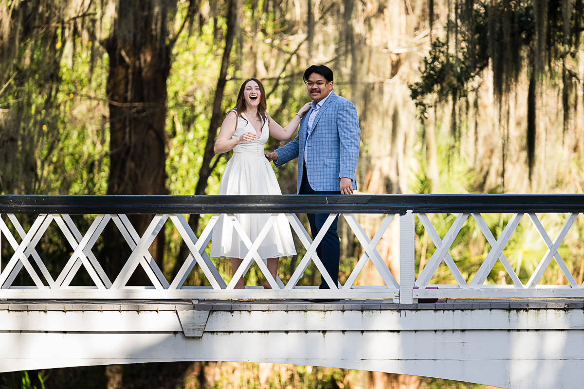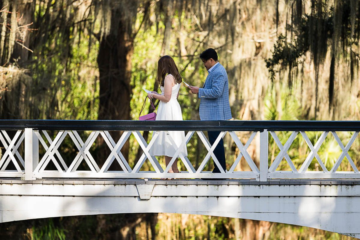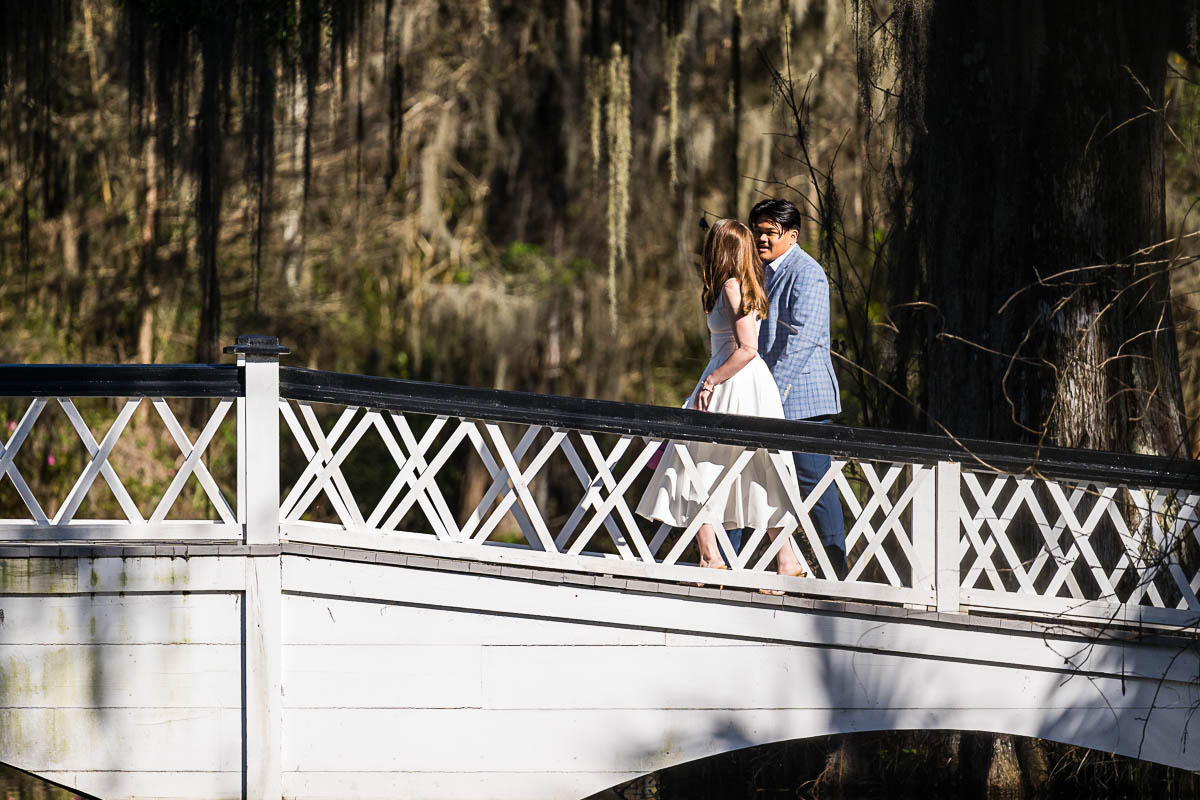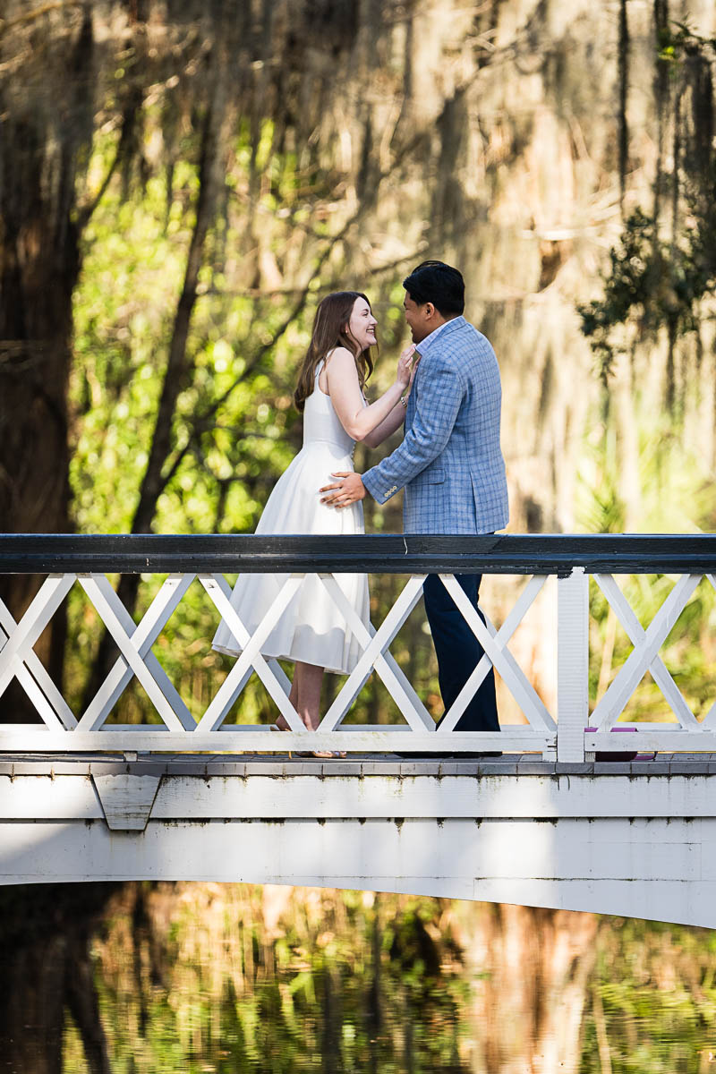 Kai and I had created a schedule, and mapped out a route for him to lead her to the bridge. Even though she had no idea what we were up to, and he had never been there before, Kai somehow managed to get her to Magnolia Plantation right on schedule, and lead her right down the path I had told him to take. Kai had cleverly told her he was there on a work trip and had to make a presentation to his team. He asked if they could get to the plantation early so that he could practice his speach! Arriving at “the spot”, he handed her a copy of the speech so she could read along. Only instead of a work speech, it was his declaration of love and devotion to Savannah. I could see the emotions welling up as she read along. Then he got down on one knee and asked her to be his wife. She said YES!!!