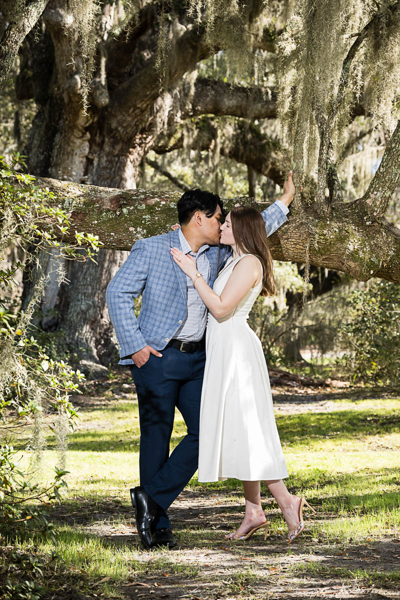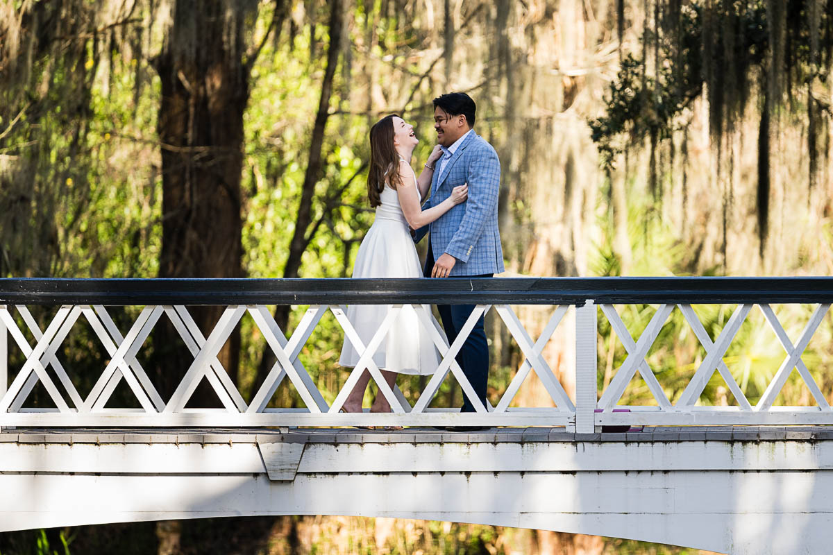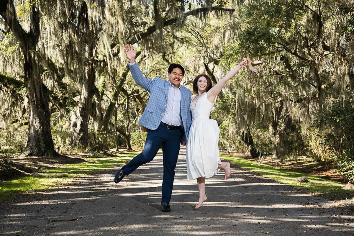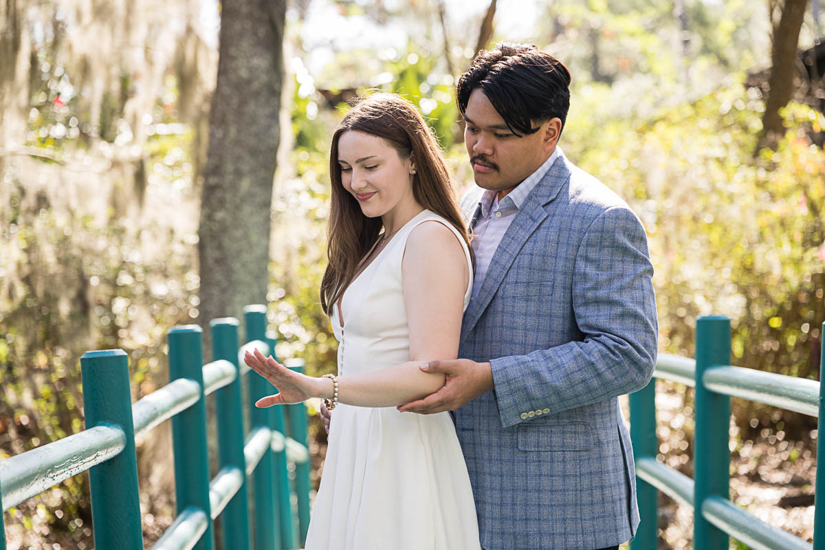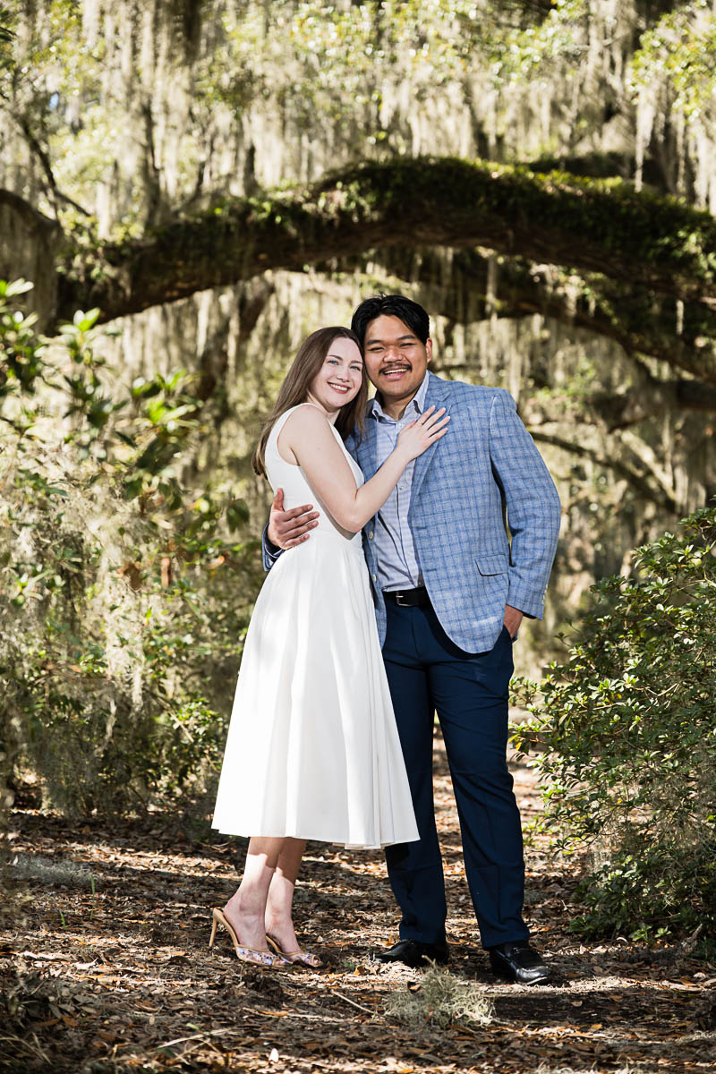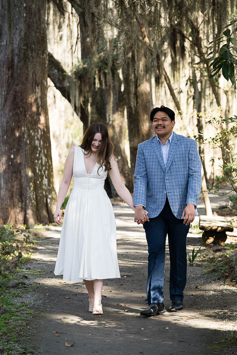 Kai and I had created a schedule, and mapped out a route for him to lead her to the bridge. Even though she had no idea what we were up to, and he had never been there before, Kai somehow managed to get her to Magnolia Plantation right on schedule, and lead her right down the path I had told him to take. Kai had cleverly told her he was there on a work trip and had to make a presentation to his team. He asked if they could get to the plantation early so that he could practice his speach! Arriving at “the spot”, he handed her a copy of the speech so she could read along. Only instead of a work speech, it was his declaration of love and devotion to Savannah. I could see the emotions welling up as she read along. Then he got down on one knee and asked her to be his wife. She said YES!!!