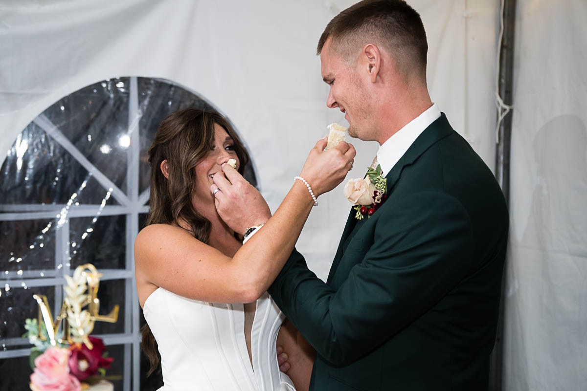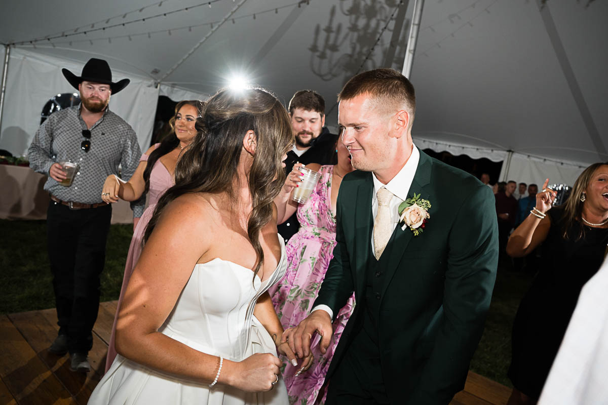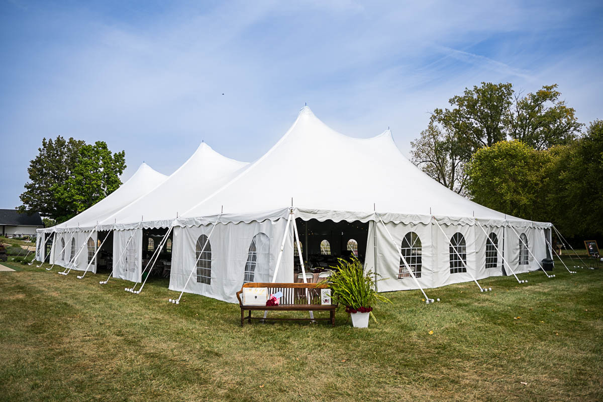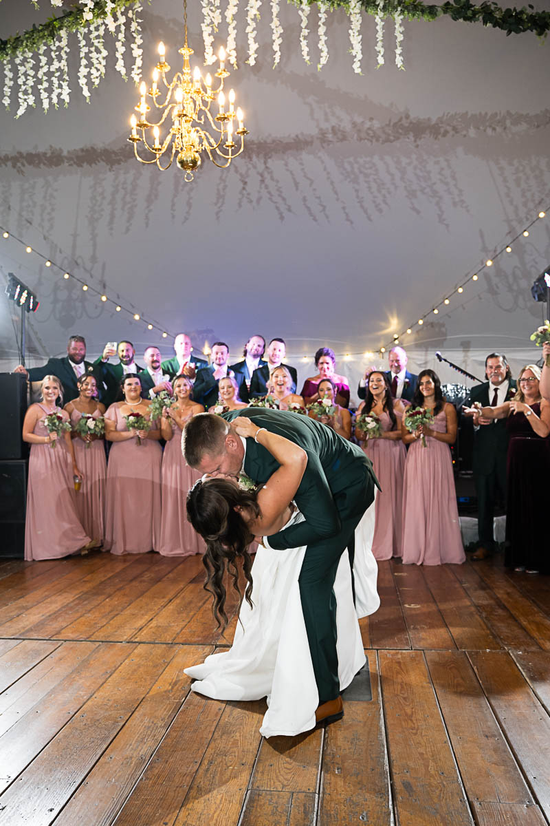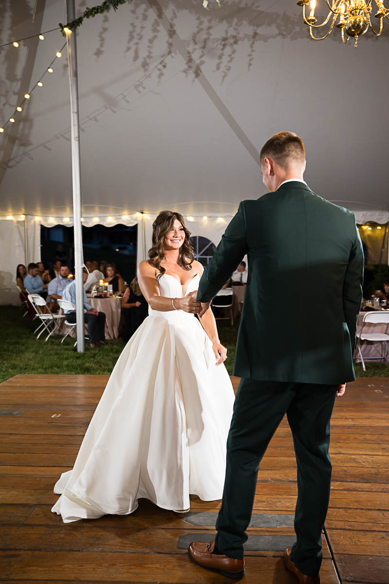 The reception was held in a giant tent on the property. With touching toasts, an auctioneer letting the highest bidding table be first to go to the buffet line, a fun cake cutting, and an awesome band keeping the party going all night long…everyone had an amazing time!!!