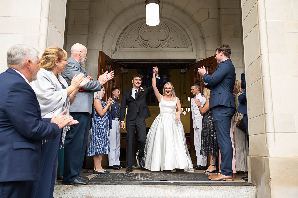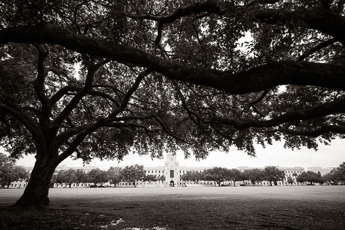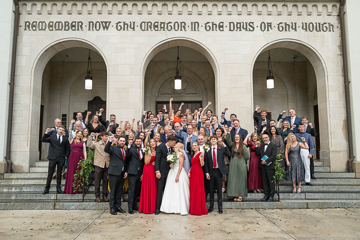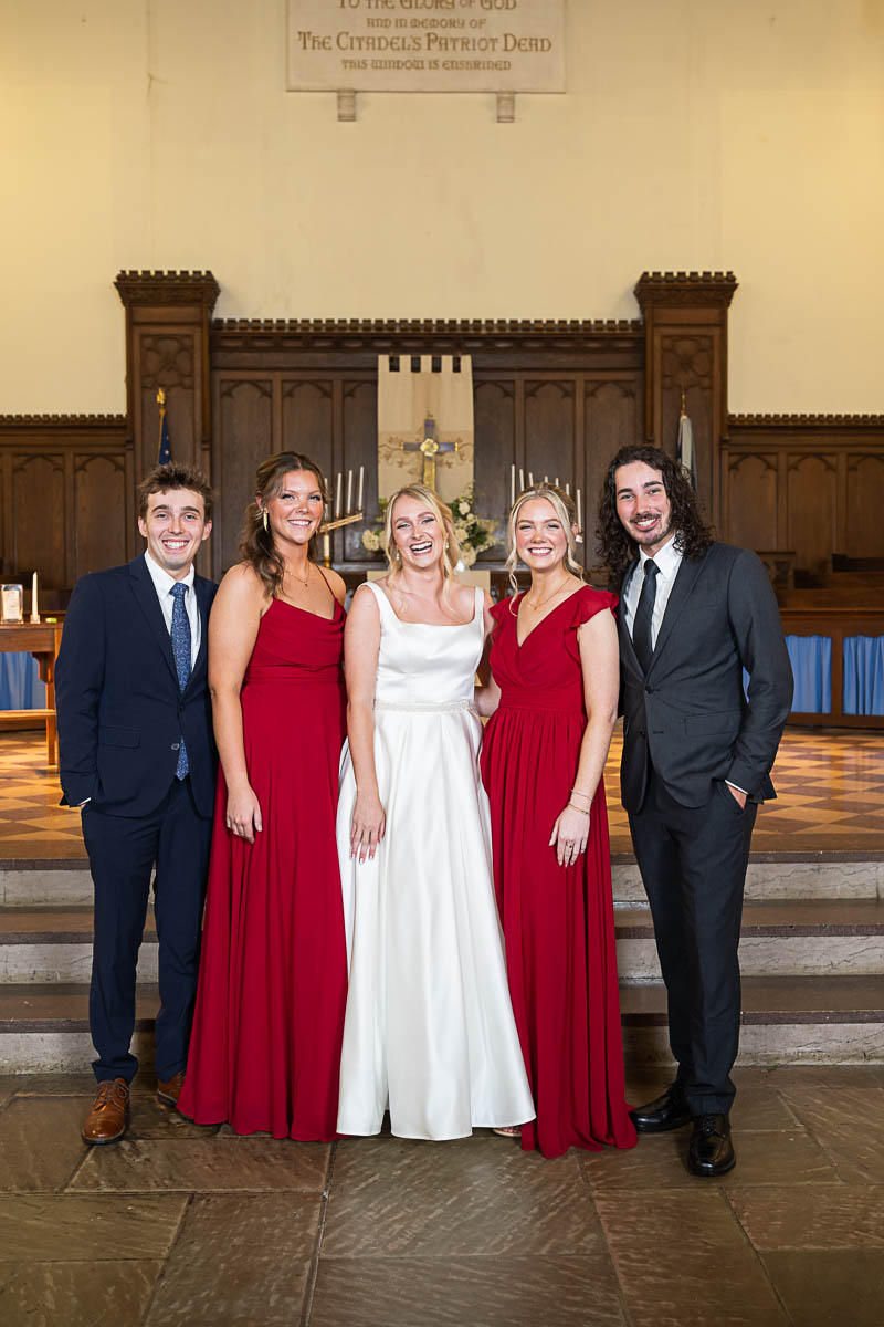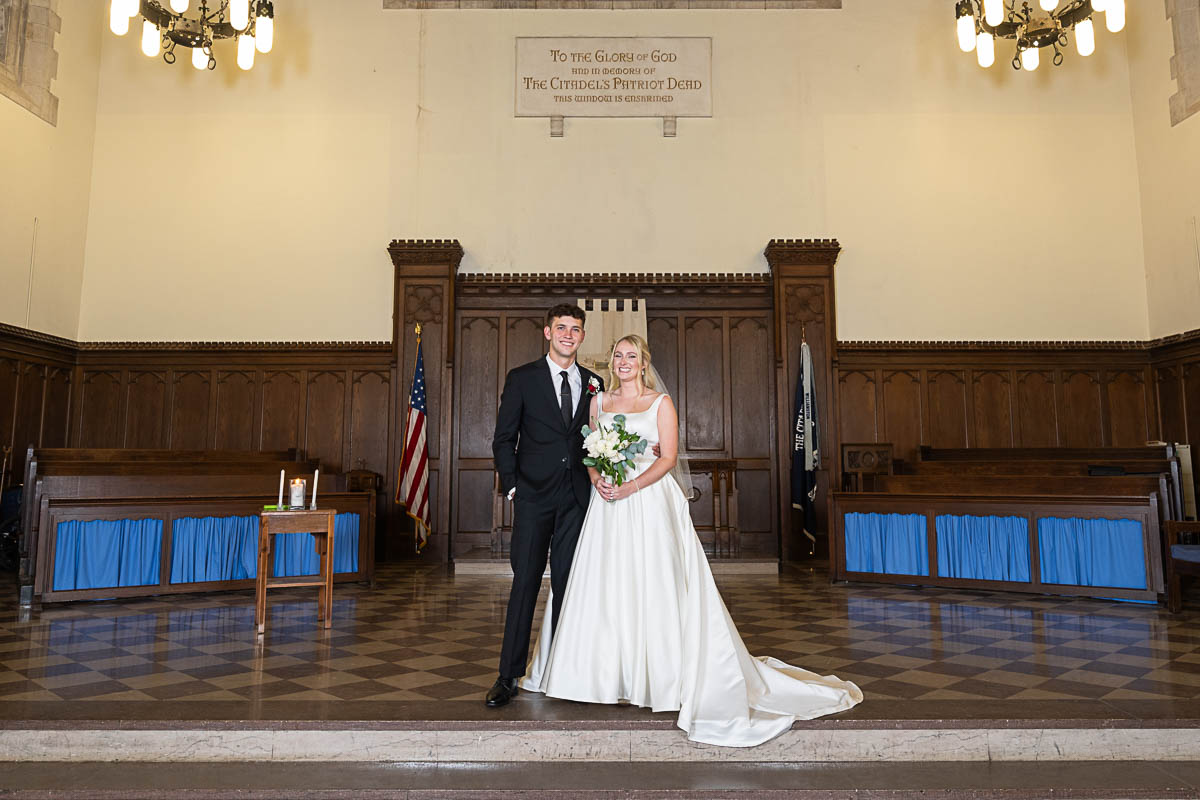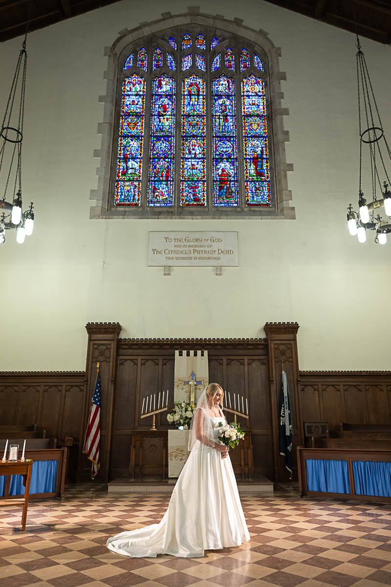 I had the distinct pleasure of photographing their nuptials at Summerall Chapel on The Citadel Campus this past weekend. The weather was dreary. But the love between these two brightened the chapel and warmed everyone’s hearts! Plus the rain let up just enough at the very end for a fun group photo with all their guests…which was one of Madison’s special requests. Plus we captured some dramatic shots of the beautiful couple on The Quad in front of Justin’s barracks.