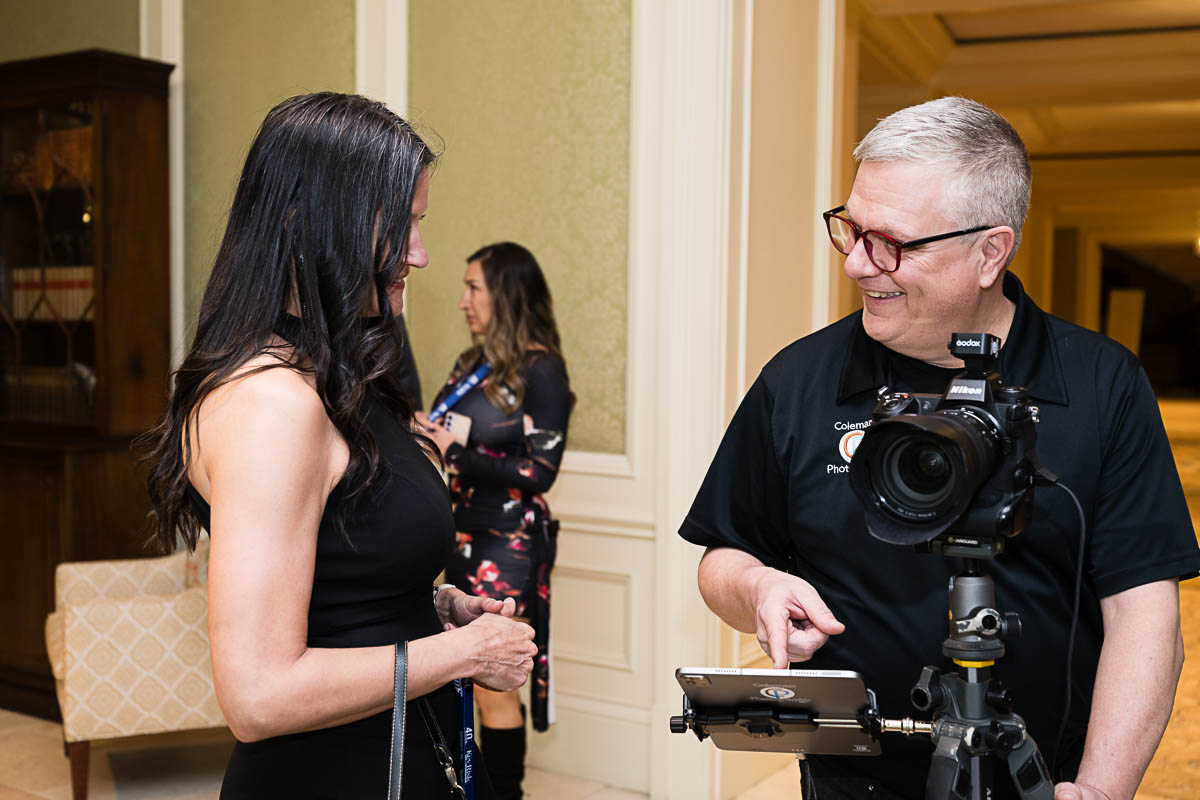 We have a variety of professional backgrounds to choose from. You can provide the company’s step-and-repeat. Or you can customize your own backdrop. We provide professional lighting, like what you would get on a supermodel fashion shoot. We include a professional photographer to help with posing and directing so that you LOOK like a supermodel. Plus having a friendly and engaging photographer makes the whole experience more fun! Last but not least, your portaits are printed as beautiful 5×7 prints, which are custome mounted in an elegant black folio with a built-in “kickstand”. This not only protects your portrait, but makes it an awesome keepsake that you can take home and display in your home or office!