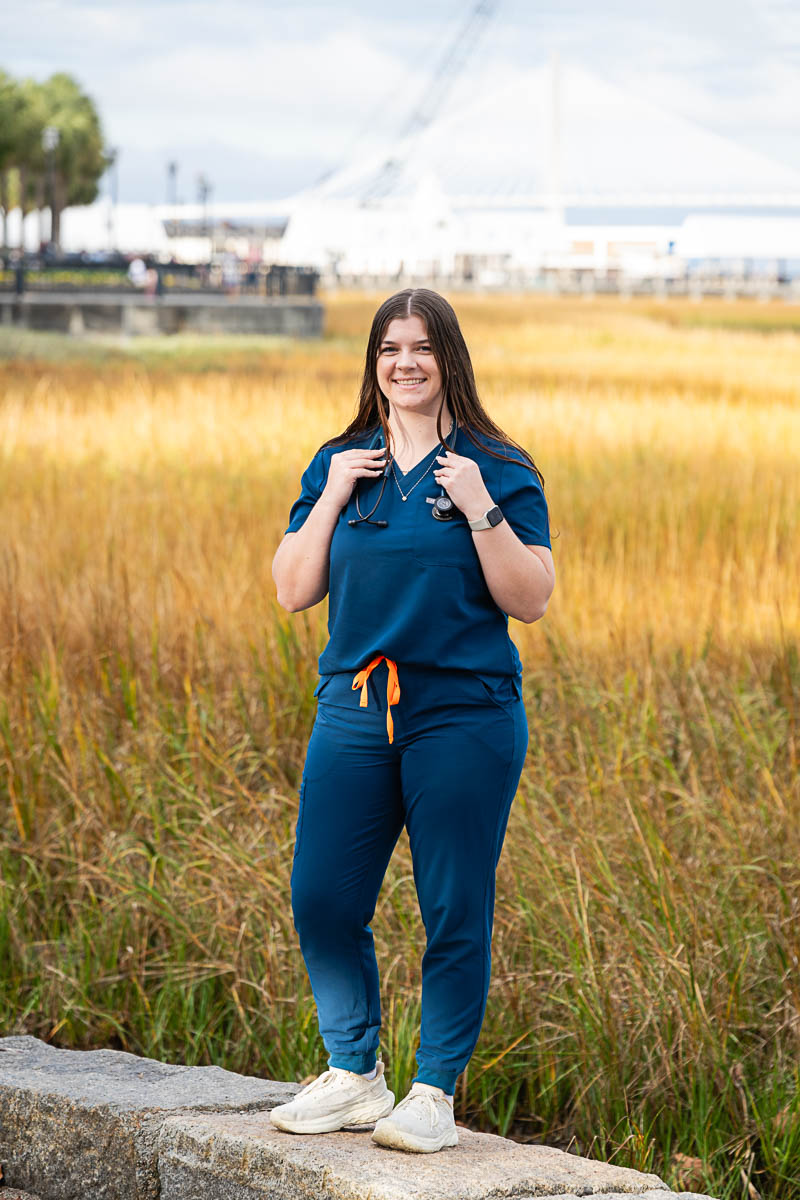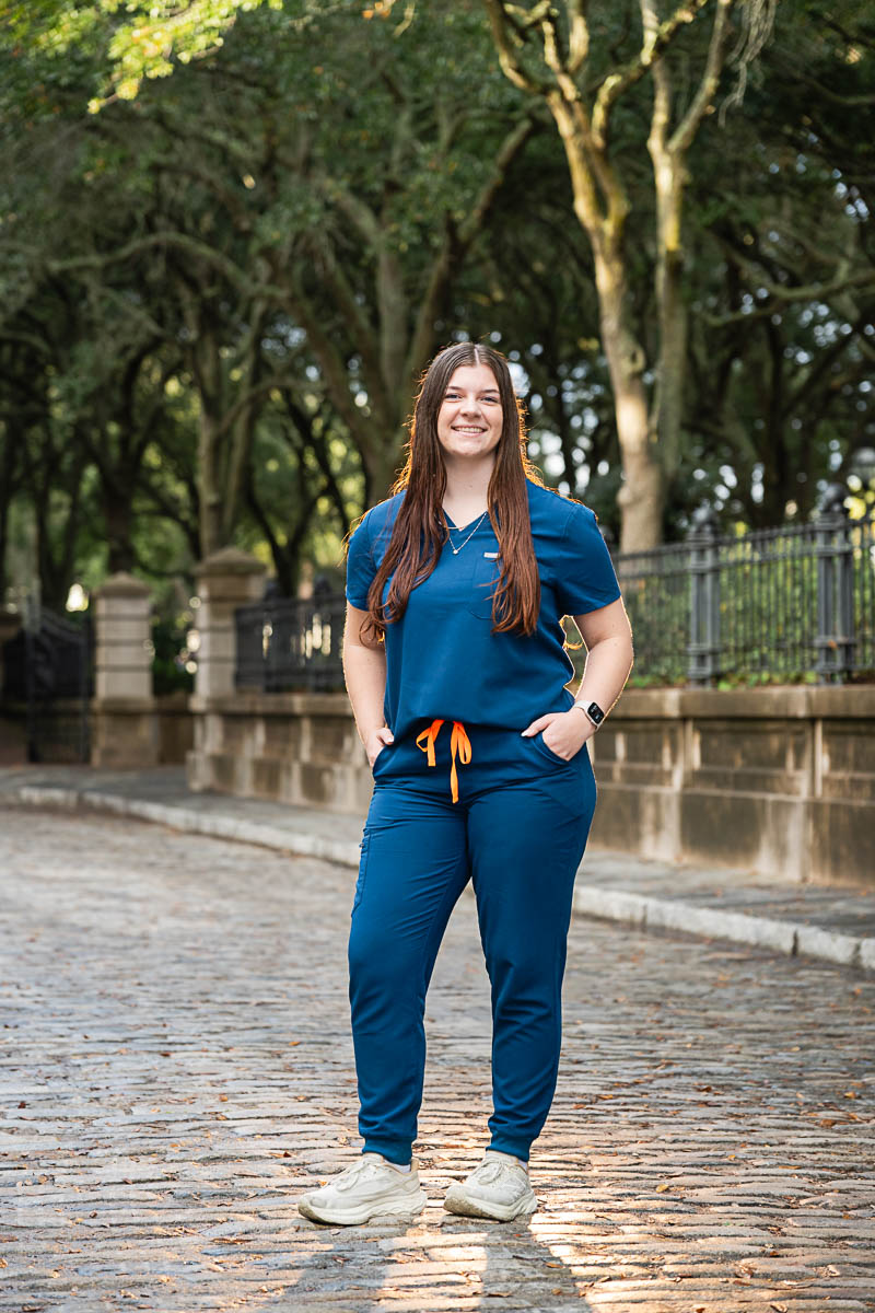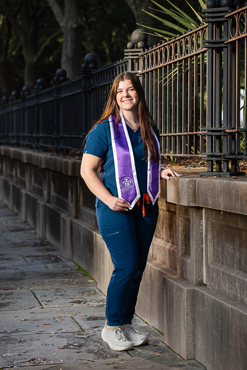 I had the wonderful opportunity to meet and photograph Shannon to celebrate her graduation from nursing school at Emory University School of Medicine. It was an exciting milestone, and I was thrilled to capture this special moment in her life. We explored the scenic backdrop of historic downtown Charleston, where we made stops at the picturesque Joe Riley Waterfront Park, the charming French Quarter, and the iconic Rainbow Row. Each location offered a unique flair that perfectly complemented Shannon’s vibrant personality.